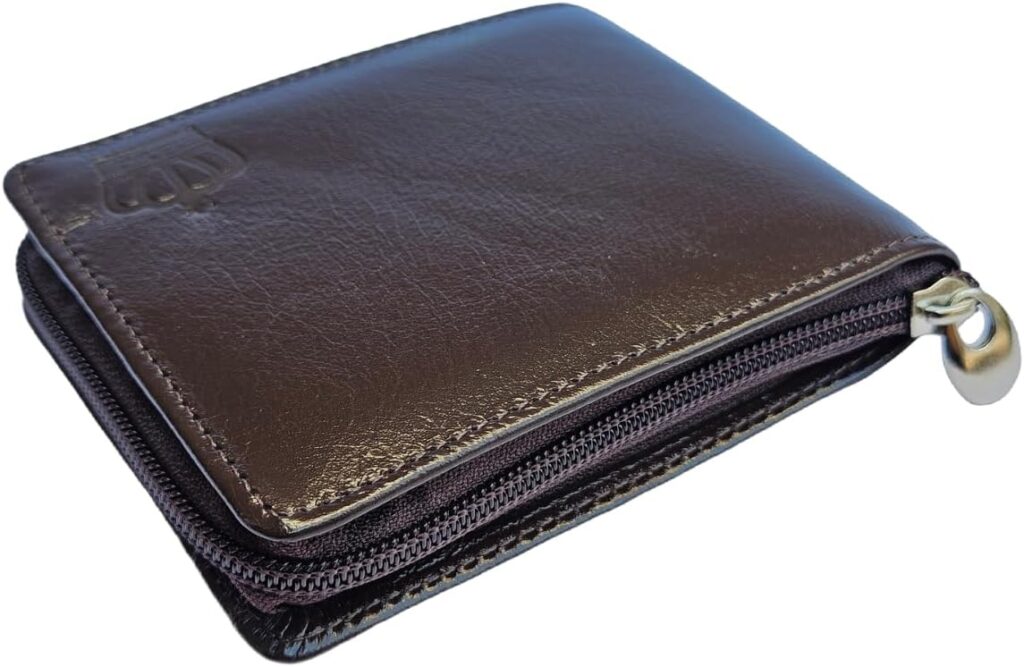 Carteira de couro masculina pequena slim com ziper marrom notas rg cnh moedas LUXXO