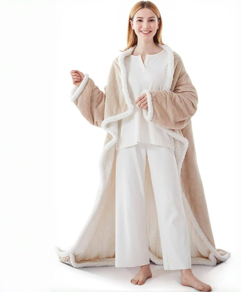 Cobertor de roupão aquecido elétrico com 10 configurações de calor e temporizador de 12 horas, cobertor de sherpa vestível com bolso para os pés e mangas, 127 x 177 cm + capa de pé de 45 cm, bege