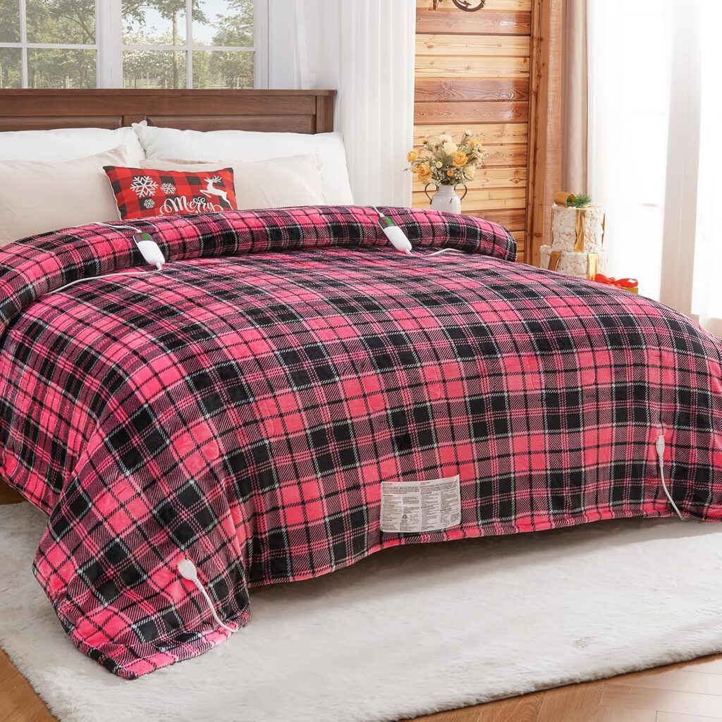 Cobertor elétrico rosa aquecido, tamanho Queen, 214 x 230, 10 níveis de calor/8 horas de desligamento automático/controle duplo para cama, cobertor xadrez azul sherpa para adultos, presente lavável