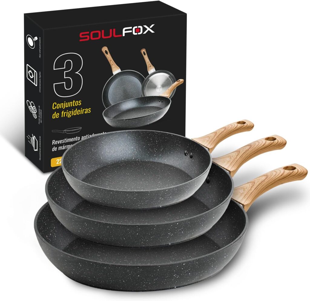 Conjunto de Frigideiras Antiaderentes, Com Base de Pedra e Cabos de Madeira, 3 Peças
