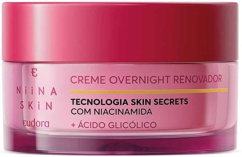 O CREME OVERNIGHT RENOVADOR de NIINA SKIN combina a tecnologia Skin Secrets com Ácido Glicólico, um poderoso AHA que promove um efeito peeling suave enquanto você dorme: acelera a renovação celular da pele, promovendo uma leve esfoliação química que uniformiza o tom da pele, reduzindo as diferenças de tonalidade enquanto melhora a textura: linhas, imperfeições e poros. Além disso, sua textura gel-creme oil-free e de rápida absorção deixa um acabamento aveludado que hidrata profundamente, sendo adequado para todos os tipos de pele, inclusive as oleosas. Resultado: aparência de pele descansada, mais lisa, luminosa, macia e suave desde o primeiro uso. Não comedogênico.