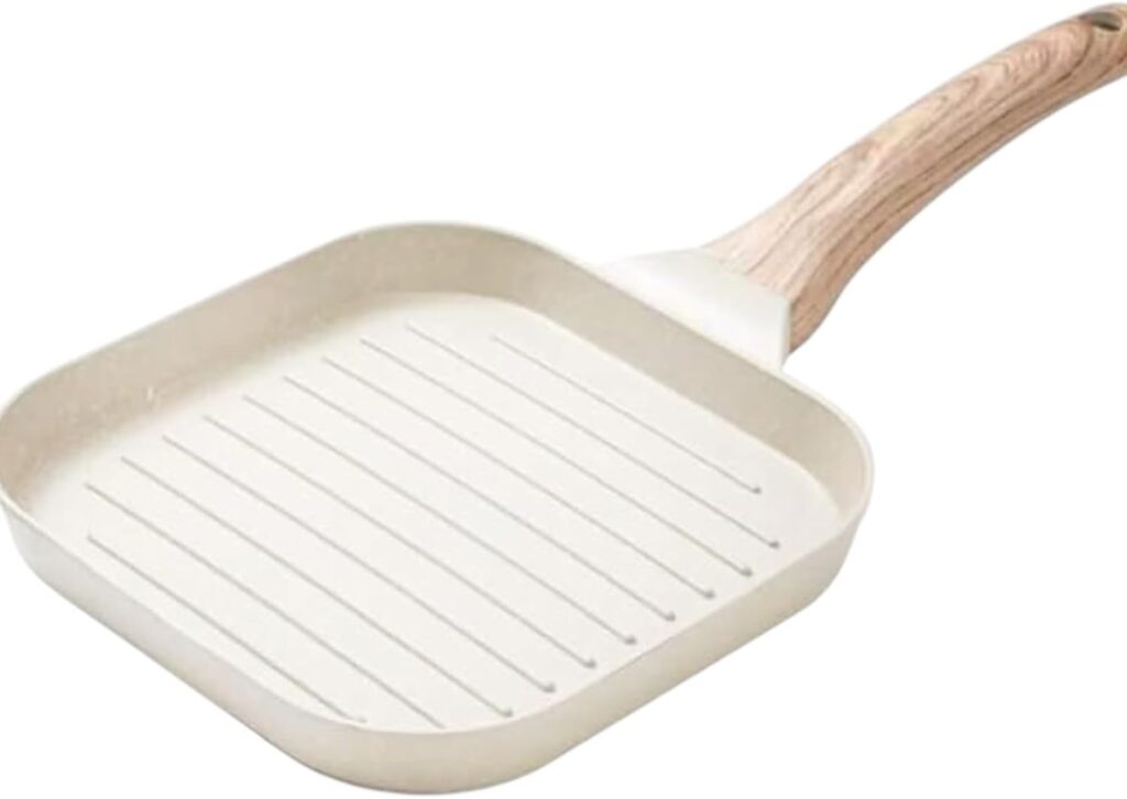 Frigideira Quadrada de Cerâmica Antiaderente 18cm com Cabo de Madeira – Ideal para Grelhar Carnes, Legumes e Omeletes (Bege)
