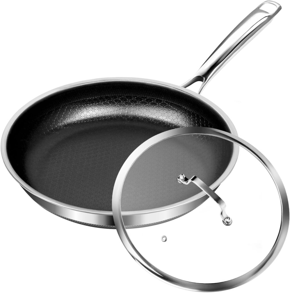 FUDELAI Frigideiras híbridas e frigideiras antiaderentes, não tóxicas de aço inoxidável com tampa, forno de indução de lava-louças, seguro para grelhar, sem PFOA (25 cm)