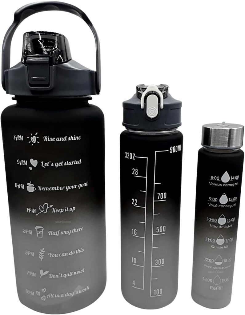 -- ACOMPANHA ADESIVOS -- ENVIO IMEDIATO ******************************************************************** COR, PRETO Kit 3 Garrafas Squeeze Degradê 2 Litros, 900ml e 300ml Fases Motivadoras com Adesivos 2D e 3D Academia Escola Treino Esta garrafa de água com marcador de tempo lhe dá motivação para atingir seus objetivos. É adequado para acampar, caminhar, andar de bicicleta, fitness e outros esportes. Fácil de transportar, pode levá-lo com você, você pode levá-lo com você, você pode encontrar escolas, escritórios, visitas, etc, onde não pode suporta-la Frasco de água livre de BPA, limpeza limpa e lava-louças automáticas, 100% livre de BPA e quaisquer ingredientes, a introdução de garrafas de água de alta qualidade porta copos de carro movível, porta copos de fitness e suporte para garrafa de mochila, muito adequado para Fitness, fitness, lazer de escritório e entretenimento Garrafa de 900ML pode ir com alça ou sem, depende do fornecedor. Característica do produto: - Adesivo Incluso! - Design de capas de reforço, um clique para abrir. - Design de alça, fácil de transportar. Especificação do produto: - Material: pp + silicone + PC. - Capacidade: 2L, 900Ml E 300ML - Resistência à temperatura: 0 graus Celsius - 80 graus Celsius. Conteúdo da embalagem: 1 Garrafa de 2 Litros com canudo e adesivos 1 Garrafa de 900 ML com canudo e adesivos 1 Garrafa de 300ML (Não utiliza canudo) e adesivo Garantia do vendedor: 30 dias