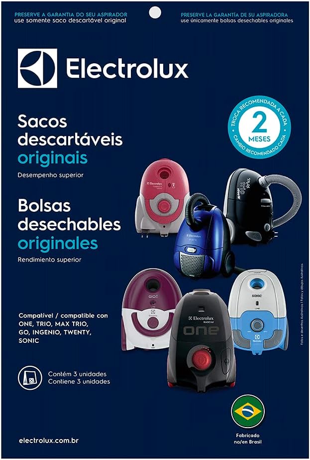 Sacos descartáveis electrolux para aspiradores de pó modelos: one, trio, max trio, go, ingenio, twenty e sonic. Alto nível de filtragem: só ele captura até 97% das micropartículas e contribui para um ambiente mais saudável e limpo. Deixe sua casa sempre limpa e sua família mais protegida; desempenho: abre de forma ideal e a trama do saco permite a passagem de ar e faz com que o aspirador mantenha a performance; ecologicamente correto: produzido com material biodegradável, não agride o meio ambiente; filtragem: possuem 2 níveis de filtragem (folha de papel e fibra) que evitam que a poeira volte para o ambiente e retém ácaros e bactérias; mais higiênico: basta utilizar e descartar, não existe contato com a poeira; prático: possui encaixes perfeitos para os aspiradores indicados, o tamanho é padronizado e já vem com o furo, fácil de instalar e descartar; produzidos no brasil. Além de assegurar a qualidade e o desempenho do produto, aumentam sua vida útil; resistência: são produzidos com a melhor matéria prima e evitam que o produto rasgue e danifique o aspirador;.