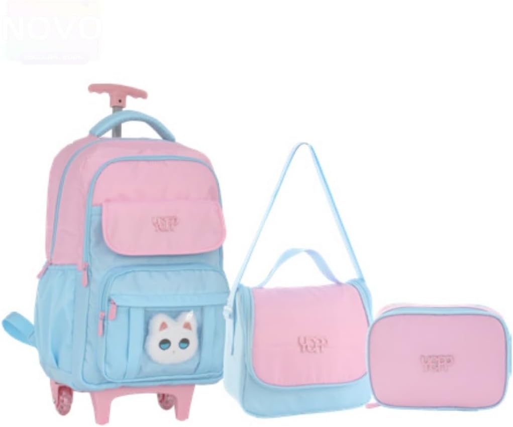 Kit Escolar 3 em 1 Mochila Gatinho fofo com Rodinhas Bolsa Tiracolo Estojo Feminina Volta às Aulas