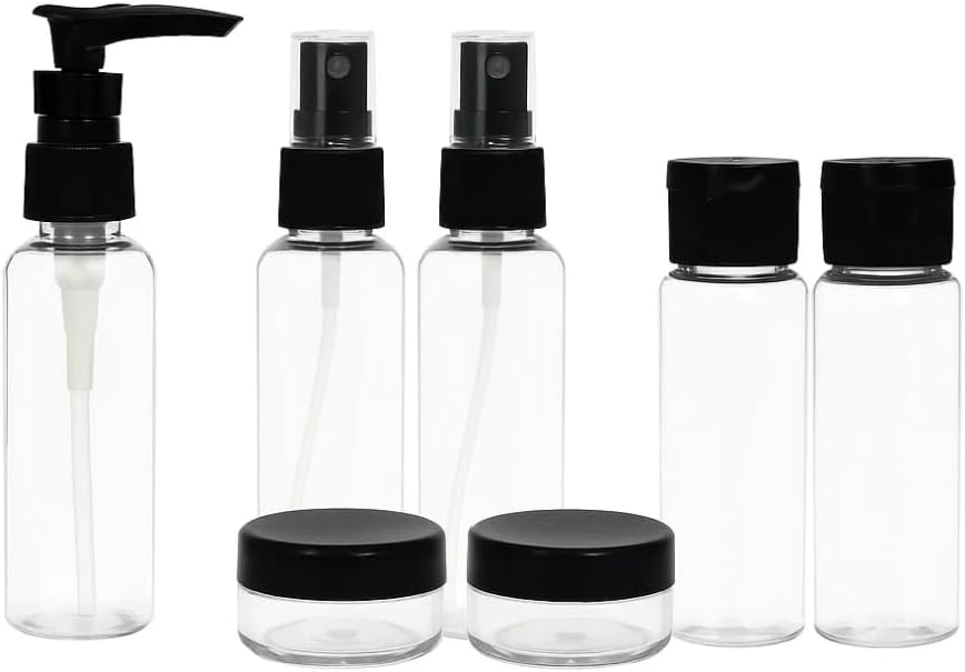 Kit Frascos para Viagem 7 Peças – Frascos Portáteis Reutilizáveis para Shampoo, Sabonete, Cremes, Cosméticos, Líquidos – Mini Potes Plásticos para Mala de Mão e Necessaire - Shop100 (Preto)