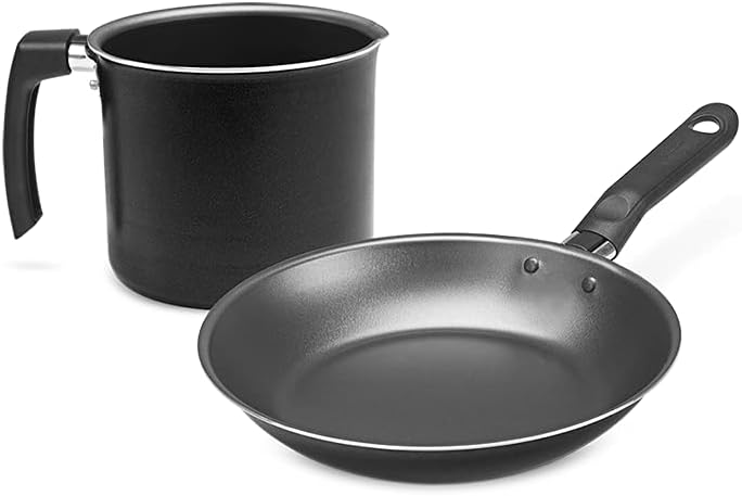 Para acompanhar as suas necessidades, a linha Ebony disponibiliza o Kit de frigideira + Fervedor, duas peças nos tamanhos Ø 20 cm e Ø 12 cm. Com estrutura de alumínio que dissipa melhor o calor e cozinha o alimento por igual e mais rapidamente. Já o revestimento interno antiaderente evita que o alimento grude mesmo com uso reduzido de óleo. O material também facilita a limpeza. Sua segurança está garantida com os cabos de baquelite que não aquecem. A dupla está disponível nas cor preto poliester, com mais brilho às peças, trazendo mais destaque para a sua cozinha.