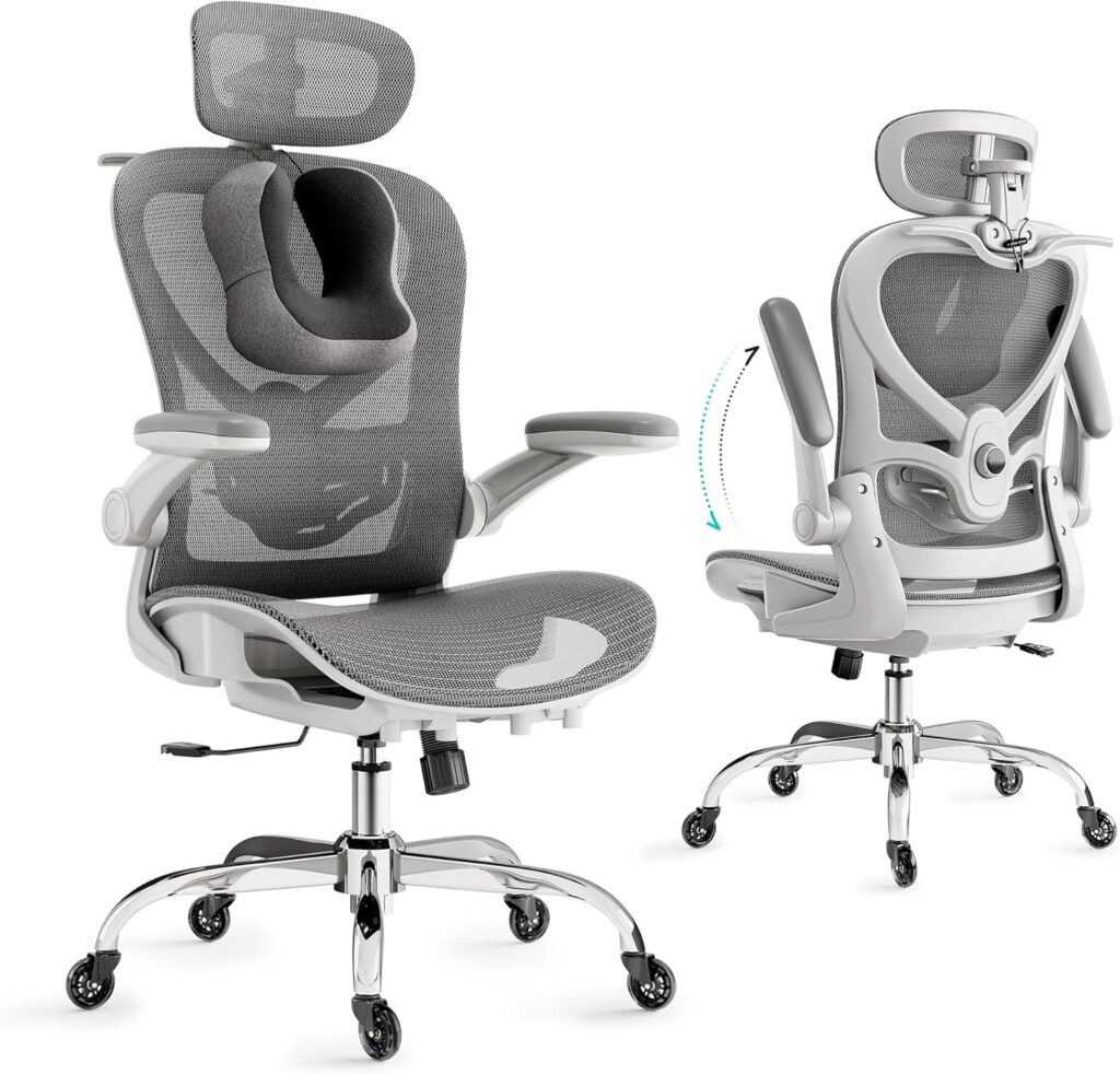 LarkLeaves Cadeira Escritorio com Travesseiro para Pescoço e Encosto de Cabeça 3D, Cadeira Ergonomica com Cabide e Rodas de Borracha, Cadeira Presidente com Suporte Lombar 2D e Braços Rebatíveis,Cinza