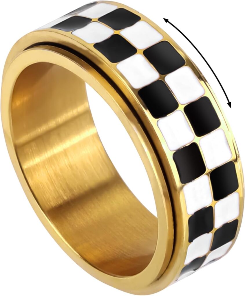 Mikovivi Checkered Fidget Ring, Black White Adults Rotating Spinner Ring Checkered Thumb Rotating Rings Gifts for Relaxation Fidget Spinner Rings for Adults
