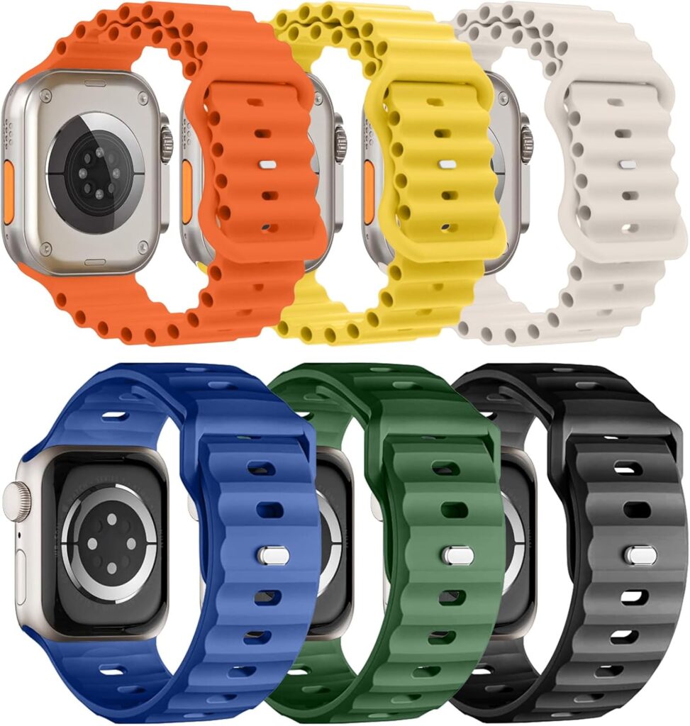 Pacote com 6 pulseiras oceânicas compatíveis com Apple Watch Ultra de 49 mm, 45 mm, 44 mm, 42 mm, 41 mm, 40 mm e 38 mm, para mulheres e homens, pulseira esportiva de silicone macio à prova d'água para
