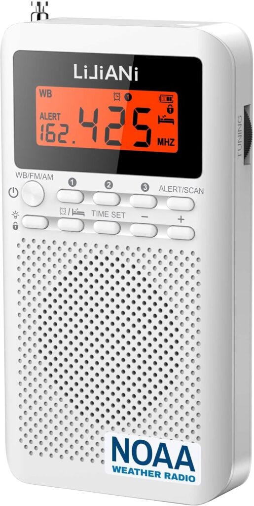 Nosso rádio com rádio de alerta meteorológico AM/FM/NOAA. Pode obter automaticamente ou manualmente transmissões meteorológicas de 7 estações NOAA em um som cristalino. Este rádio meteorológico pode monitorar e alertar automaticamente o clima perigoso em sua área, como furacões, tornados e tempestades, ganha um momento crítico para você obter preparação completa avançada, mantendo você e sua família seguros com este rádio Noaa. Tamanho pequeno: 12 x 7 x 2 cm, conveniente para você carregar ou colocar na bolsa de mergência.
