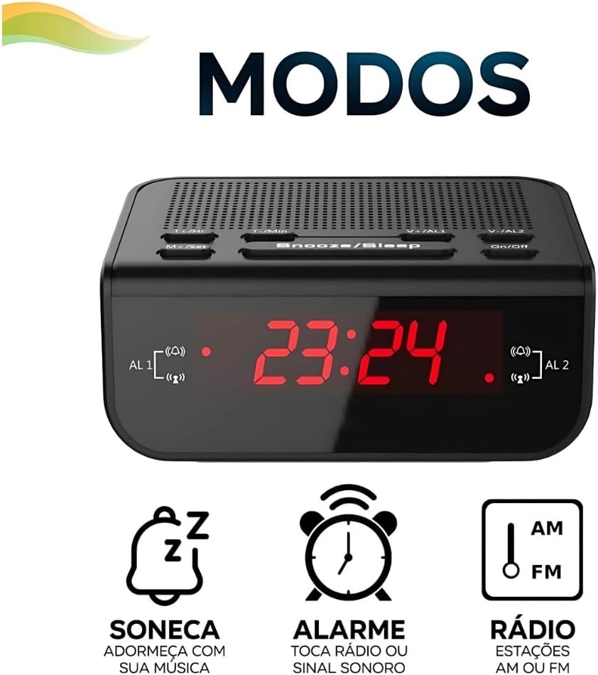 • Funções: Hora (12h/24h), alarme, snooze, rádio AM/FM