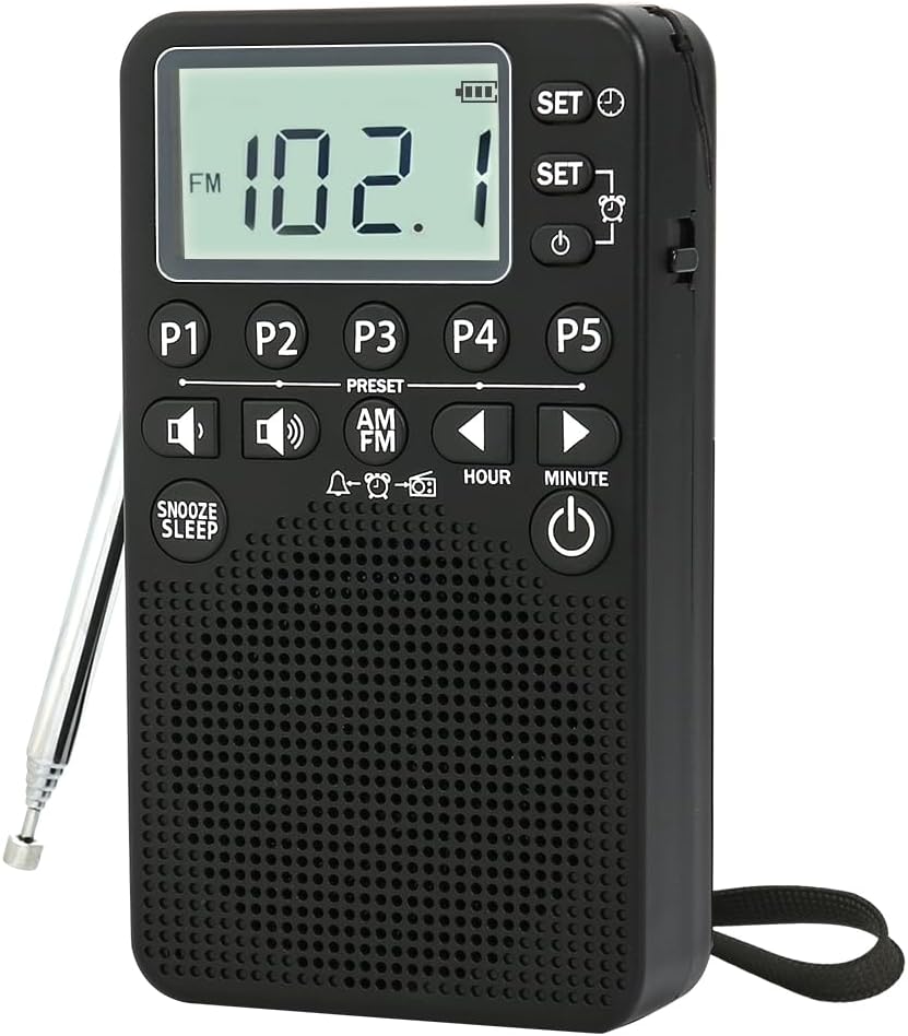 RunningByte Rádio de bolso AM FM com visor LCD, melhor recepção, alto-falante, conector de fone de ouvido, pré-definido, despertador, longa duração, 3 pilhas AA
