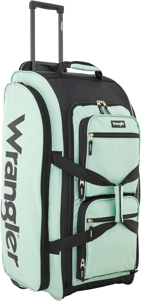 Bolsa esportiva Wrangler 76 cm com rodas verticais com rodinhas com mais espaço de armazenamento do que bagagem. Melhor uso para longas férias e viagens em família.