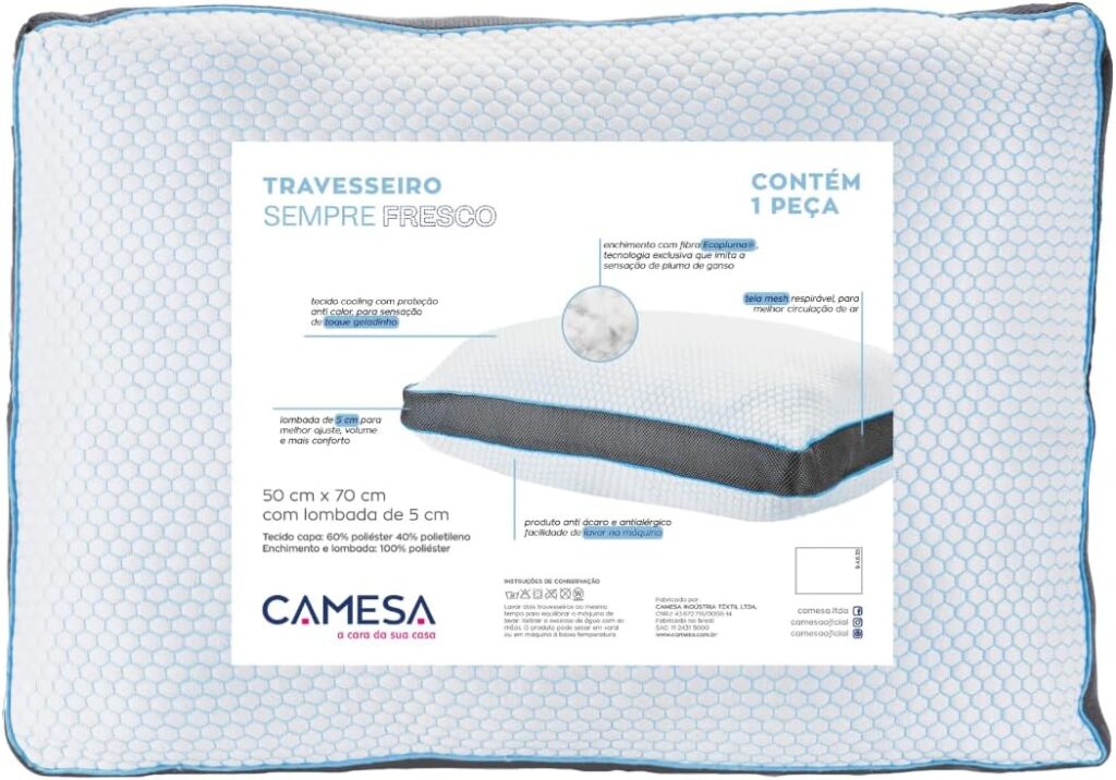 O Travesseiro Sempre Fresco é a solução perfeita para quem busca conforto e frescor. Com um tecido cooling e uma lombada de 5 cm, o travesseiro oferece o suporte ideal para a cabeça e o pescoço, aliviando a pressão e evitando dores. Além disso, o Travesseiro Sempre Fresco é antialérgico, lavável à máquina e com tecnologia exclusiva que imita a sensação de pluma de ganso. Experimente o Travesseiro Sempre Fresco e tenha noites de sono mais relaxantes e revigorantes. DIMENSÕES E QUANTIDADES: - Dimensão: 50cm x 70cm - Tamanho: Largura 50cm x Comprimento 70cm - Com Lombada De 5cm - Capa Base: 40% Polietileno / 60% Poliéster - Capa Lateral: 100% Poliéster - Enchimento: 100% Poliéster Fibra Ecopluma 8 - Tela Mesh - Marca: Camesa BENEFÍCIOS E DIFERENCIAIS - Tecido Cooling Com Proteção Anti Calor: Para Sensação De Toque Geladinho - Lombada De 5 Cm: Para Melhor Ajuste, Volume E Mais Conforto - Enchimento Com Fibra Ecopluma 8: Tecnologia Exclusiva Que Imita A Sensação De Pluma De Ganso - Tela Mesh Respirável: Para Melhor Circulação De Ar - Produto Anti Ácaro E Antialérgico - Facilidade De Lavar Na Máquina ATENÇÃO - Produtos de decoração não inclusos. Imagens meramente ilustrativas; - As cores dos objetos podem sofrer alterações devido a luminosidade, configurações do monitor e até mesmo a percepção do usuário; - Esse é um produto de alta qualidade, e para aumentar a vida útil, aconselhamos que siga rigidamente as recomendações de lavagem de acordo com a etiqueta do produto;