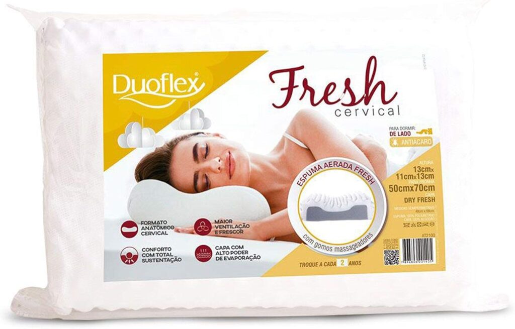 Travesseiro fresh cervical produzido em espuma aerada de poliuretano. Formato anatômico. Com gomos massageadores que estimulam a circulação. Suporte extra firme com maior frescor e ventilação. Com antiácaros, fungos e bactérias.