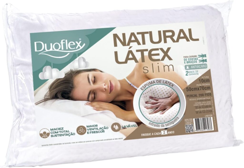 Travesseiro Duoflex Natural Látex Slim, medida para fronha 50 x 70 cm, altura 10 cm, intermediário, com capa percal 200 fios com zíper 100% algodão, lavável, antiácaro. Produzido a partir da seiva da seringueira, o travesseiro Natural Látex é o de maior aceitação no mundo, pois adapta-se com perfeição a todas as pessoas. Sua estrutura permite maior durabilidade e conforto, além do toque mais macio, aveludado e fresco. Eles permitem total sustentação da cabeça garantindo um sono tranquilo e confortável a noite toda. Não é preciso afofar o travesseiro após o uso, porque sua matéria prima e sua estrutura celular única permitem retornar à sua forma original mesmo depois de uso intensivo e contínuo. Composto por milhões de células abertas, o travesseiro Natural Látex é moldado com centenas de furos que formam canais internos de circulação de ar que facilitam a respiração e ventilação, fazendo com que ele fique a todo o tempo numa temperatura levemente inferior à do corpo, além de permitir evaporação rápida de umidade e transpiração, prevenindo odores e contaminações. Além de serem antiácaros, fungos e bactérias, são esterilizados um a um na produção, garantindo total higienização. Por serem laváveis, higiênicos, frescos e extremamente confortáveis são indicados para todas as estações e climas. Medida para fronha: 50 cm x 70 cm Altura: 10 cm Características: - Capa Percal 200 fios - 100% algodão com zíper; - Espuma Látex Natural; - Maciez com total sustentação; - Maior ventilação e frescor; - Lavável; - Antiácaro.