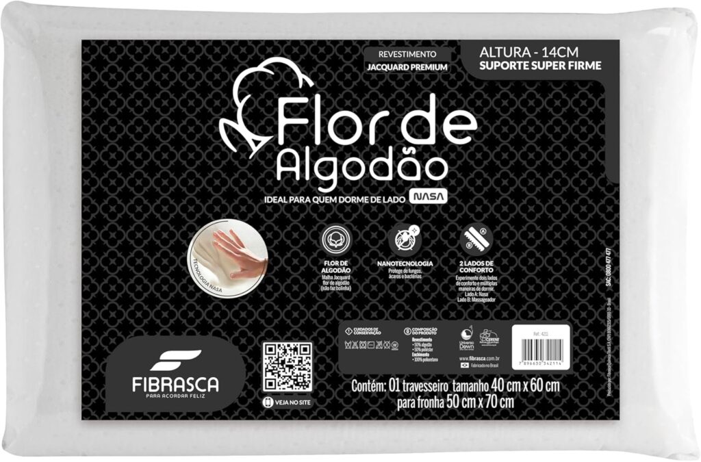 O Travesseiro Flor de Algodão Nasa traz a solução dupla face que agrega dois enchimentos em um só produto, trazendo versatilidade e alta tecnologia para o conforto do sono. A solução dupla face é composta de uma face em espuma com gomos massageadores e a outra lisa em Nasa (visco), trazendo versatilidade com duas opções distintas que trazem mais conforto e qualidade de vida para o dia a dia. A capa em exclusiva malha jacquard Flor de Algodão Fibrasca traz maciez ao toque e possui tratamento íons de prata que protege contra ácaros.