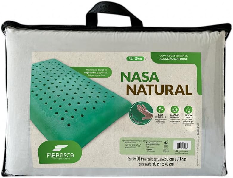 O Travesseiro Nasa Natural foi desenvolvido com tecnologia NASA (viscoelástico) Ecológico com percentual de origem vegetal, este enchimento absorve a pressão do corpo e estimula a circulação sanguínea, além de possuir furos na sua estrutura que permitem a passagem de ar trazendo mais frescor para o rosto quando em contato. O Nasa natural Alto Fibrasca possui 15 cm de altura. A capa em tecido eco tem redução de 90% no consumo de aguá durante o processo produtivo é um percal 100% algodão natural, com zíper podendo ser lavado em máquina de lavar.