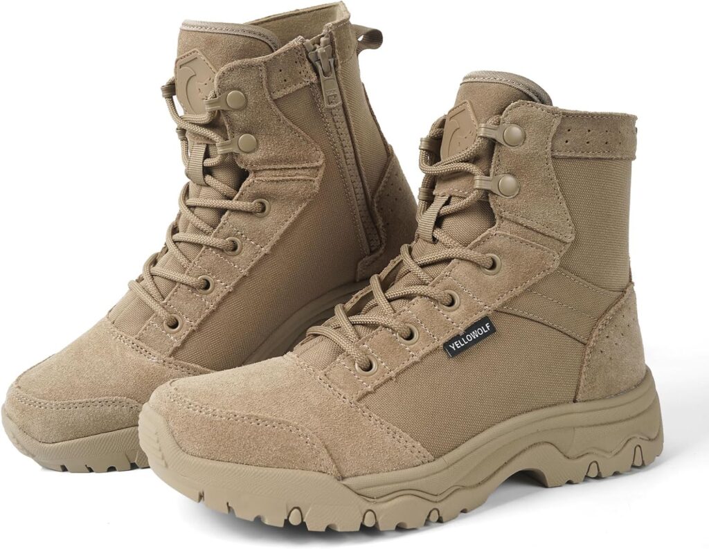 YELLOWOLF As botas militares táticas leves femininas são feitas de couro de camurça de 1,5 mm e tecido de nylon 1000D. A sola adota entressola leve de absorção de choque de EVA e sola de borracha antiderrapante. Excelente material para garantir sua robustez, configuração de sola razoável para garantir sua aplicabilidade em todos os terrenos. Pode ser usado como botas de caminhada femininas, botas de trabalho femininas, sapatos de caminhada, sapatos de trabalho.